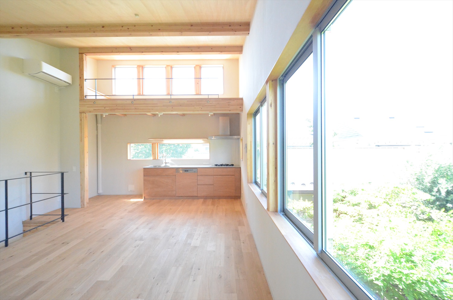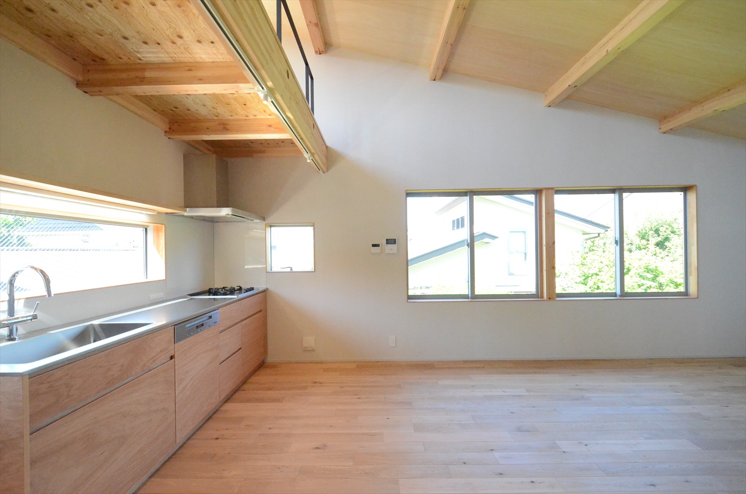 キッチン上部の空間を活かし、ちょっとしたロフトスペースを確保。取り外し式の梯子を設置すれば、ロフトにあがることもできます。ハイサイドライトからは明るい陽光が差し込み、室内のどこにいても気持ちよく過ごせます。