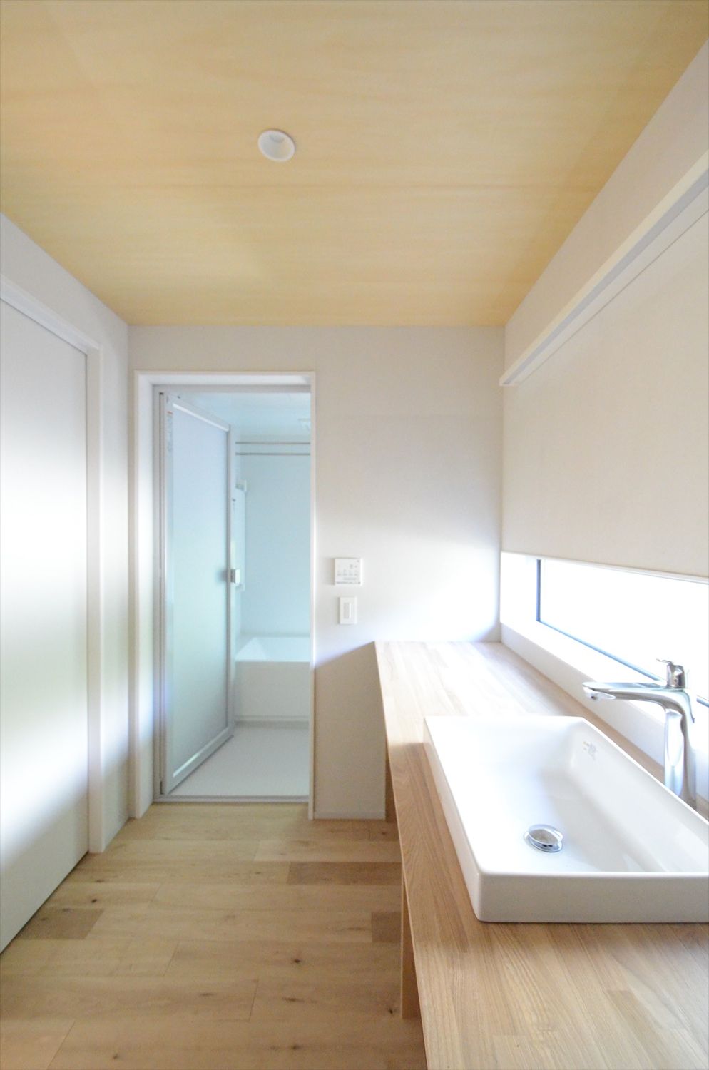 ゆったり使えそうなワイド目の洗面台にすることで、朝の忙しい時間帯も快適に。床や天井、洗面台を木の素材にして、ナチュラルで清潔感のある雰囲気になっています。木の床材は、裸足で歩いても気持ちのよいものです。