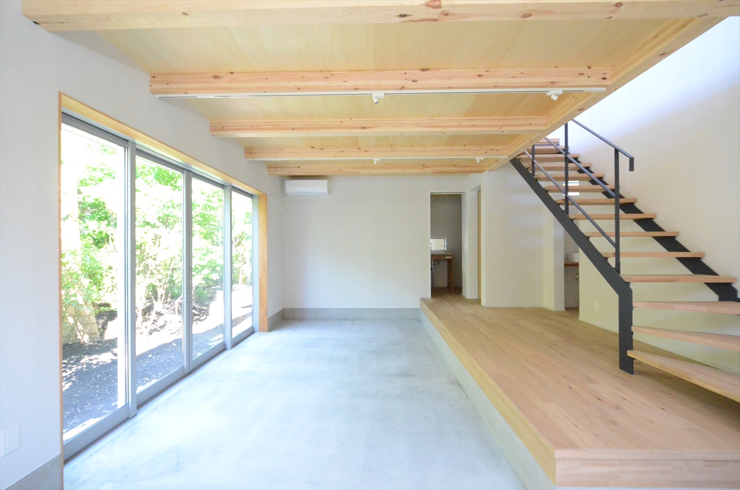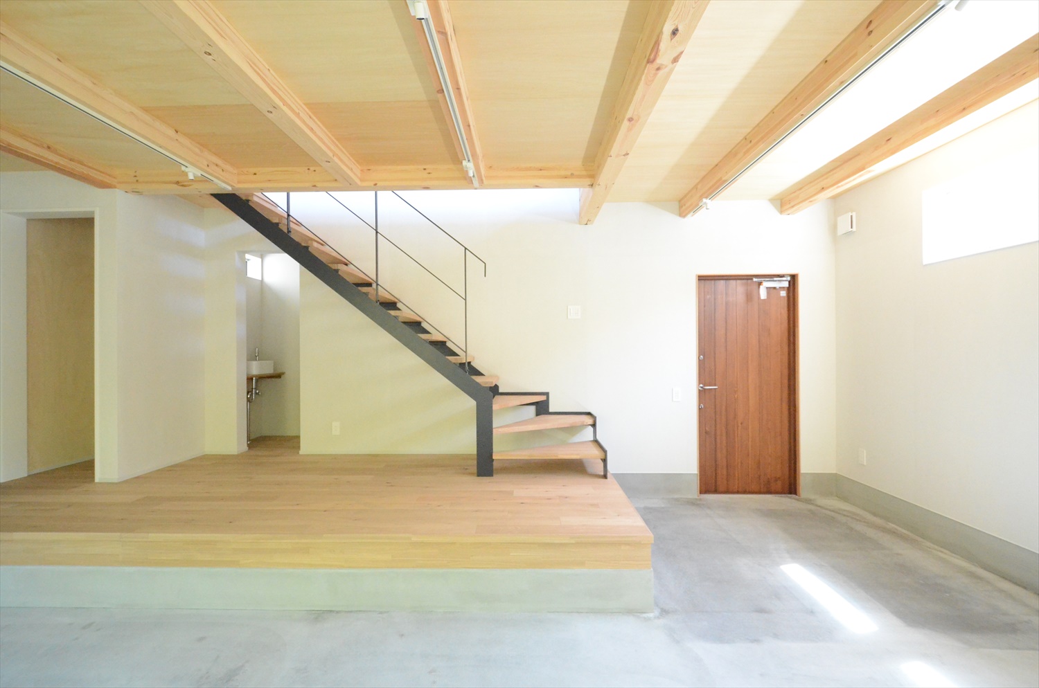 ワンフロアの半分以上を土間スペースにするという、大胆な間取り。土間に面して大きな掃き出し窓があり、庭への出入りがしやすく、趣味やDIYなどを楽しむこともできます。