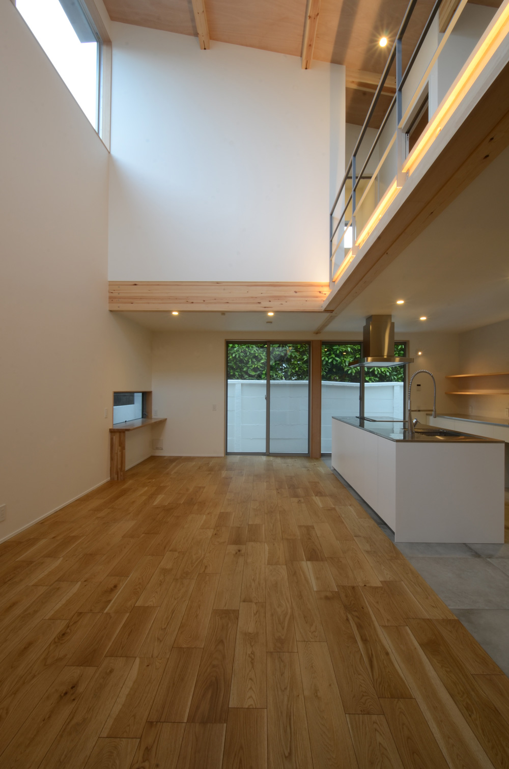 2層分の吹き抜けを持つLDK。窓は大きなものが高い位置にあり、また、低い位置にある窓はすりガラスになっているので明るさはキープしつつ、外部からの視線は気になりません。