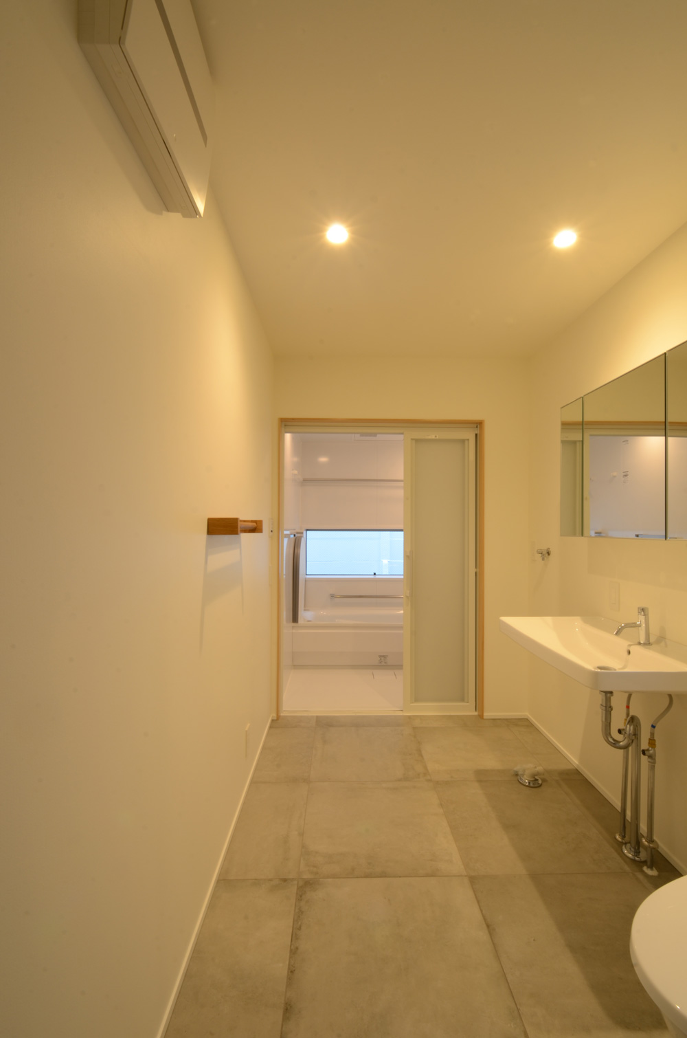 水廻りもシンプルに1空間にまとめられています。鏡幅が広いので朝の身支度も家族で鏡を共有できて便利です。浴室にも窓が付けられているのは明るさと換気の点でメリットです。