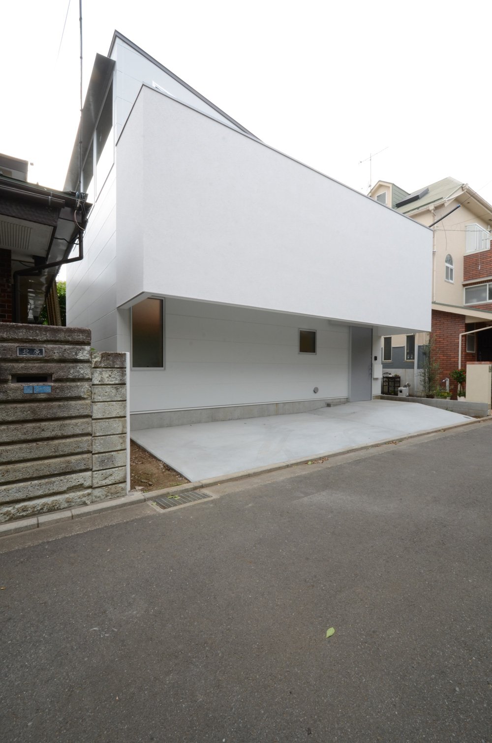 白いシンプルな空間。四角い箱から突き出た形の勾配屋根がシャープさを感じます。前面は駐車が出来るスペースになっていますが、二階部分が屋根になっているので雨の日の車の乗り降りも安心です。